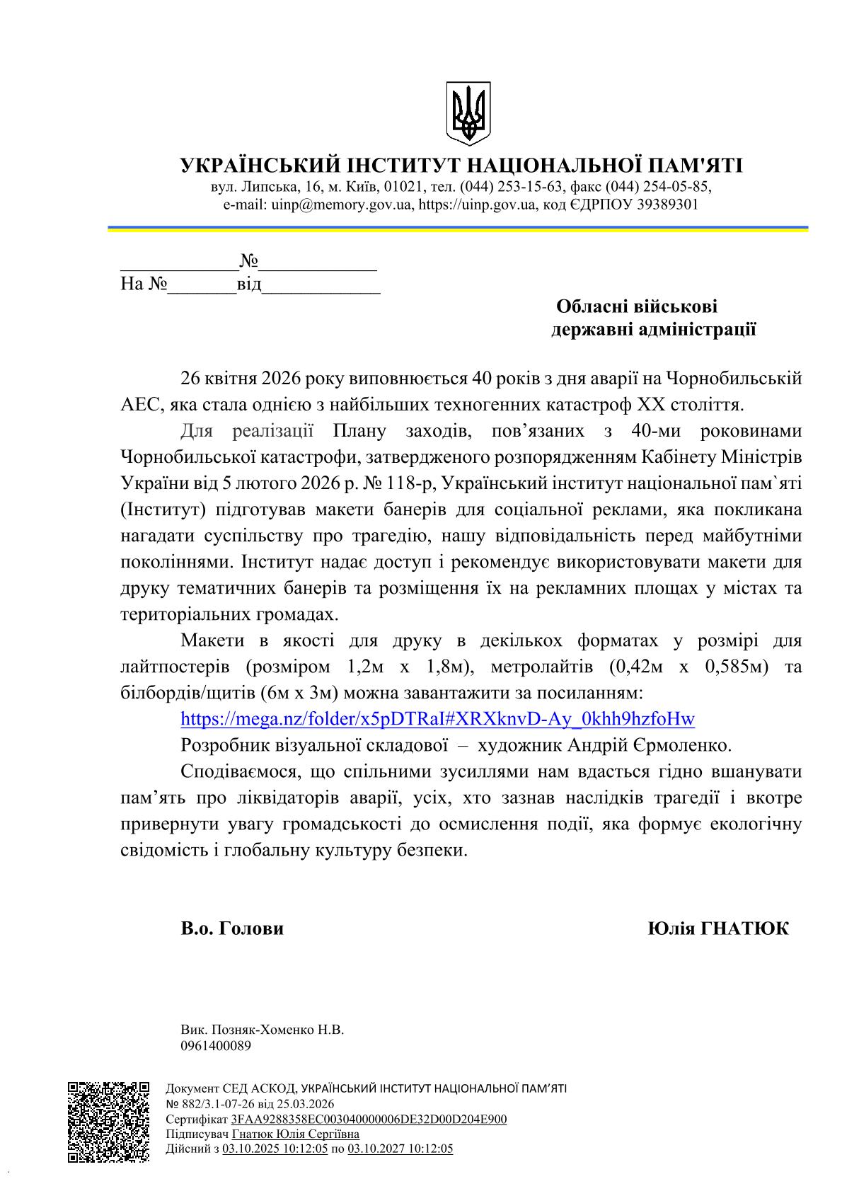 Інформаційне повідомлення. Просимо керівників Чорнобильських організацій розглянути можливість розміщення на банерах, білбордах плакати до 40-х роковин Чорнобильської катастрофи згідно п.10 Постанови Верховної Ради України "Про вшанування учасників ліквідації наслідків аварії на Чорнобильській АЕС та про заходи, пов'язані з 40-ми роковинами Чорнобильської катастрофи" За консультаціями по цьому питанню звертатись до Деркача О.С. тел:0972671925 | |